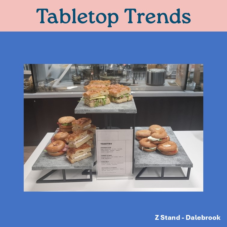 3.Elevation – there’s a strong focus on elevated designs, using tiered stands, risers, and other vessels to create artistic, multi-level displays that blend practical, adaptable setups with striking and creative aesthetics. These designs also help in venues tight on space, allowing operators to display more food in a compact footprint.