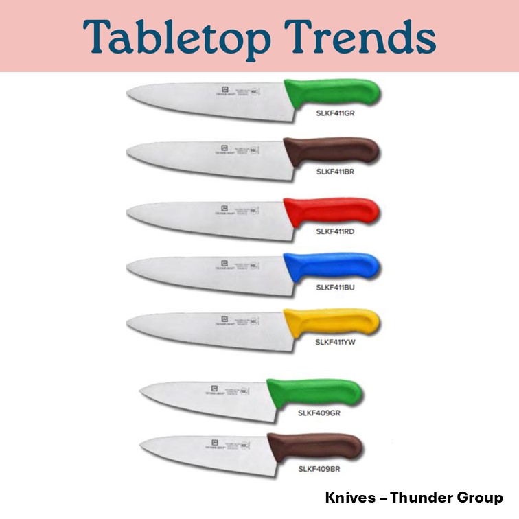 Thunder Group has released a range of quality kitchen knives made with high carbon German steel and available with a selection of brightly coloured polypropylene handles. The range includes Santoku knives, slicer knives, chef’s knives in both 10 and 8 inch sizes, boning knives, paring knives and bread knives, each available with green, brown, red, blue or yellow handles. This makes it easy to maintain separate equipment for different dietary or allergenic regimes, with the high quality steel maintaining sharpness.
