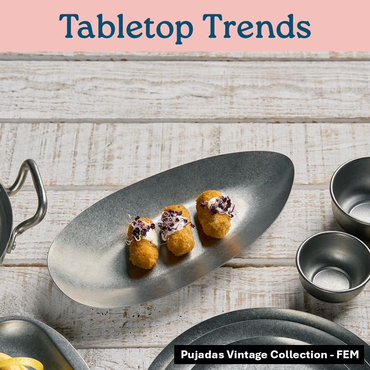 Pujadas’ new Vintage Tabletop Tableware, launching in 2026, stands out for its wide variety of pieces, including plates, bowls, round and oval saucepans, sauce boats, and platters, all designed in both classic and more expressive shapes. The combination of round, oval, and slightly unconventional forms allows chefs to plate creatively, whether for small starters, sharing boards, or full main courses. Made from durable stainless steel with an elegant vintage finish, each piece is dishwasher safe and offers a timeless, attractive aesthetic.